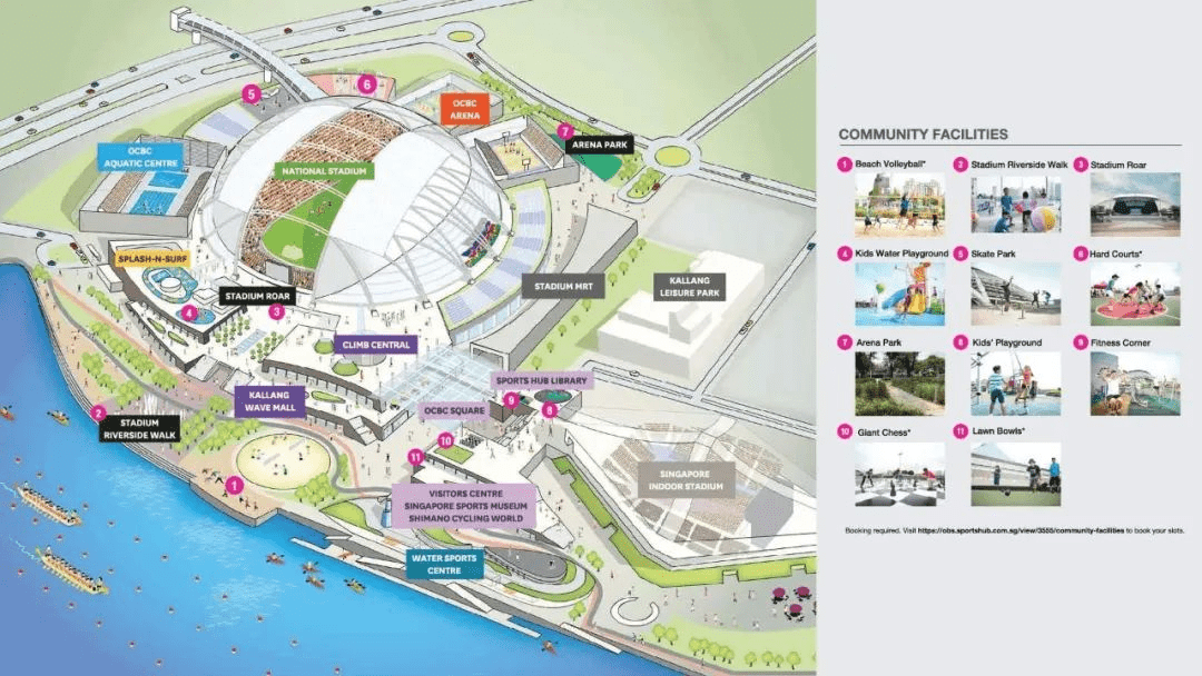 国家体育馆由两层楼内的六个场地组成,可以满足的体育活动包括:羽毛球、击剑、跆拳道、篮球、网球、排球、乒乓球,甚至水上运动等。具体信息如下,在官网预订即可:https://www.sportshub.com.sg/