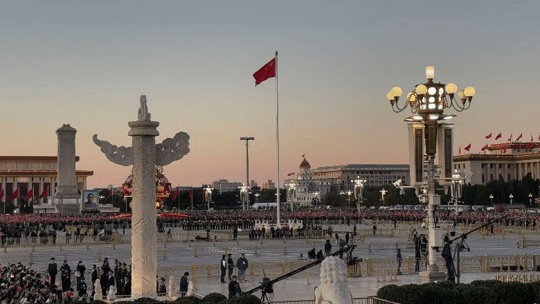 学联代表登上天安门前观礼台观看升旗仪式,向祖国母亲送上留新学子的最诚挚祝福,祝福伟大祖国繁荣昌盛、国泰民安!