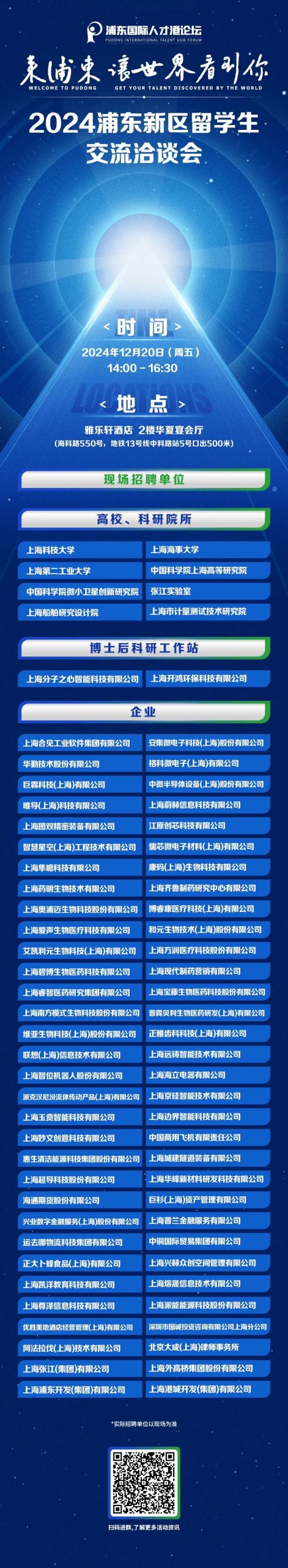 2024浦东新区留学生交流洽谈会诚邀广大留学生参会 2024-12-16 18:00 | 685 12月7日,2024浦东国际人才港论坛在张江科学会堂顺利举办,今年论坛以“引领·汇智·共赢”为主题,构建“1+3+X”形式,包括1场主论坛和3场产业人才论坛,以及全区范围内同期举办的X场人才主题系列活动。 作为2024浦东国际人才港论坛X场人才主题系列活动之一,2024浦东新区留学生交流洽谈会将于12月20日(周五)在上海张江雅乐轩酒店(海科路550号)举办,诚邀各位留学生参加。 来源:上海浦东人才发展有限公司 往期精选 关于自新加坡前往中国旅客疫情防控要求的通知 学联纳新进行时 | 一起解锁无限可能 领事保护|中国留学生安全手册 留学,从兴国到强国! 感谢您对学联长期以来的支持和关心 长按图片即可扫描二维码关注我们 本篇文章来源于微信公众号:新加坡中国学者学生联合会